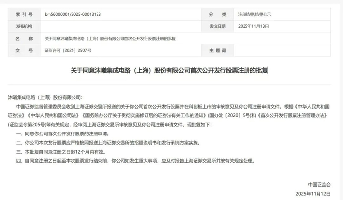 11月13日,证监会网站显示,证监会于11月12日同意沐曦集成电路(上海)股份有限公司(简称“沐曦股份”)首次公开发行股票的注册申请。同日,上交所网站显示,沐曦股份科创板IPO已注册生效。