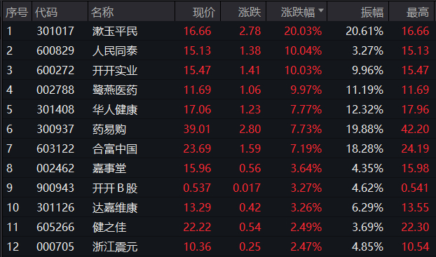 11月14日早盘,医药商业板块集体走高,行业指数大涨1.89%;板块中漱玉平民、人民同泰、开开实业、鹭燕医药涨停,华人健康、药易购、合富中国上涨超7%。
