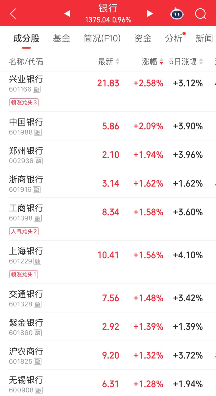 11月14日早盘,42只银行股集体上涨,兴业银行、中国银行上涨超2%,郑州银行、浙商银行、工商银行、上海银行上涨超1.5%,其中工商银行、农业银行股价再创历史新高。