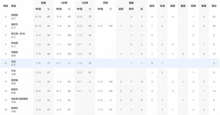 数据统计方面,广东全运女篮,武桐桐24分3篮板4助攻3抢断,杨舒予20分3篮板,李嘉琳17分,陈丽宇14分7篮板。