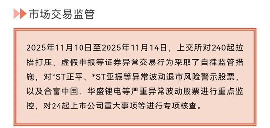 上交所最新发布的信息显示:11月10日至11月14日,上交所对240起拉抬打压、虚假申报等证券异常交易行为采取了自律监管措施,对*ST正平、*ST亚振等异常波动退市风险警示股票,以及合富中国、华盛锂电等严重异常波动股票进行重点监控,对24起上市公司重大事项等进行专项核查。