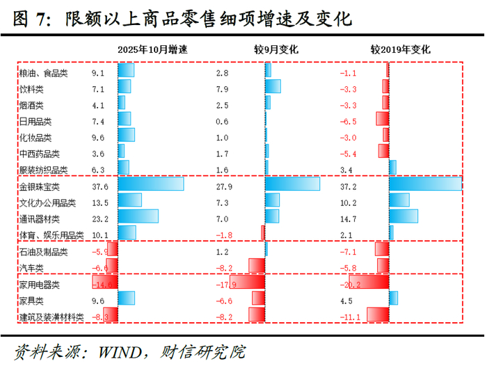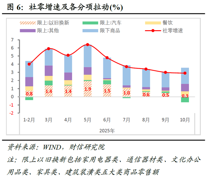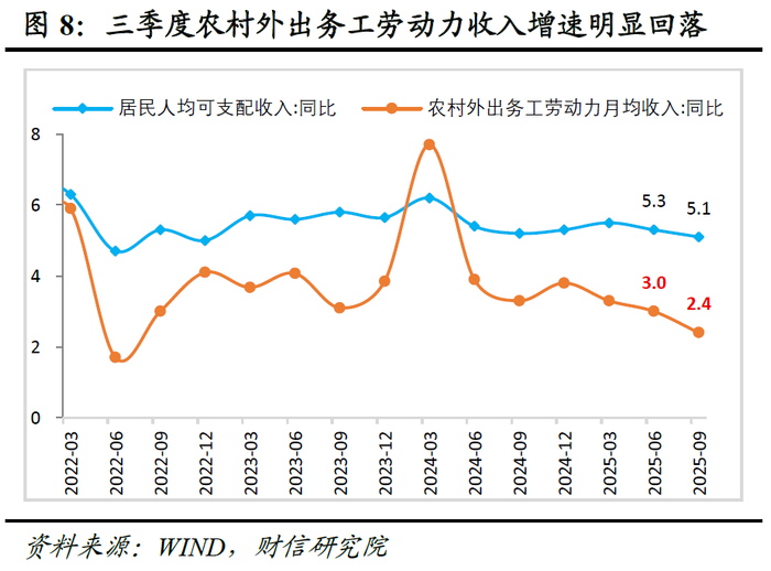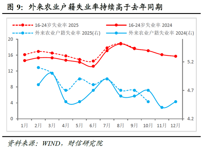 一是餐饮收入明显回升。受益于国庆和中秋假期叠加的带动,餐饮收入同比增长3.8%,,较上月提高2.9个百分点,对社零的拉动较上月提高0.3个百分点(见图5-6)。二是基本生活类和升级类消费品改善较多。受益于促消费政策显现、股市回暖带来的财富效应,10月剔除汽车和以旧换新外的限额以上商品对社零的拉动较上月提高约0.5个百分点,其中基本生活类和升级类商品增速均有所回升(见图5-6)。三是中低收入群体消费小幅改善。受益于育儿补贴等促消费政策影响,代表中低收入群体消费的限额以下商品零售增速,较上月小幅回升,对社零的拉动较上月提高约0.1个百分点(见图6)。但受就业增收困难影响(三季度外出务工劳动力收入增速显著放缓、外来农业户籍人口调查失业率持续高于去年同期(见图8-9)),其改善的持续性有待观察。相比之下,汽车受高基数的影响,增速较上月回落8.2个百分点至-6.6%;以旧换新政策带动作用继续减弱,本月限额以上单位家用电器类、文化办公用品类、家具类、通讯器材类、建筑装潢类商品零售额合计对社零的拉动比上月回落0.2个百分点(见图6-7)。