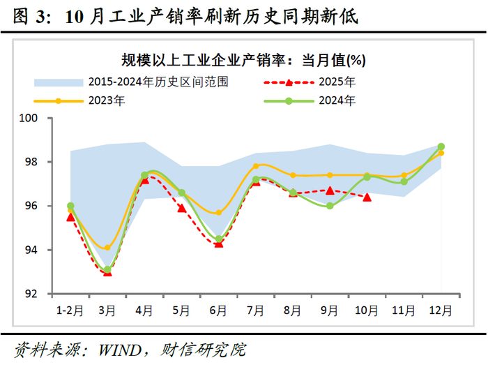 往后看,新质生产力稳步发展、新型政策性金融工具、5000亿地方政府债务结存限额等政策发力显效,有望继续对工业生产形成支撑;但需求端投资、消费、出口走弱对生产端的制约增强,加上经济“供强需弱”矛盾依旧突出(10月规上工业企业产销率再度刷新历史同期新低(见图3)),以及基数即将抬升,工业生产增速大概率稳中有降。