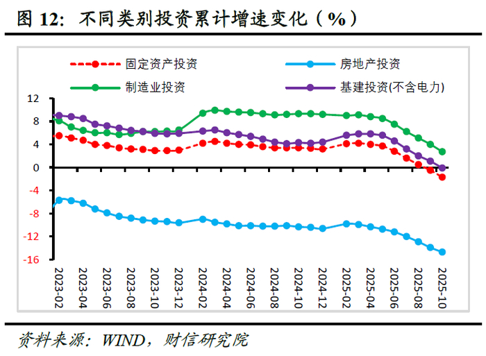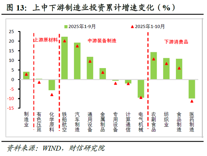 1-10月份制造业投资同比增长2.7%,较1-9月份放缓1.3个百分点,连续5个月回落幅度在1个百分点及以上;倒推当月同比增速为-6.7%,降幅较9月份扩大4.7个百分点,疫后高基数、内外需走弱以及反内卷对中长期投资意愿形成压制是主要拖累。具体看:其一,2020-2024年1-10月制造业投资平均增长6.6%,高于同期全部投资平均增速2.6个百分点,累积的高基数效应对今年增速形成一定压制。其二,受房地产、基建投资需求走弱和传统行业反内卷行动深化影响,上游原材料行业投资增速降幅继续扩大(见图13),对制造业投资形成较大拖累。其三,受出口下行以及两新政策效应下降影响,中游装备制造业投资增速也普遍回落,但产业升级和供应链安全仍支撑部分高技术行业投资维持韧性,如铁路船舶航空航天和其他运输设备制造业、汽车制造业投资增速仍维持双位数增长。其四,受国内就业压力增加、消费需求疲弱影响,下游消费品制造业投资增速也明显回落。
