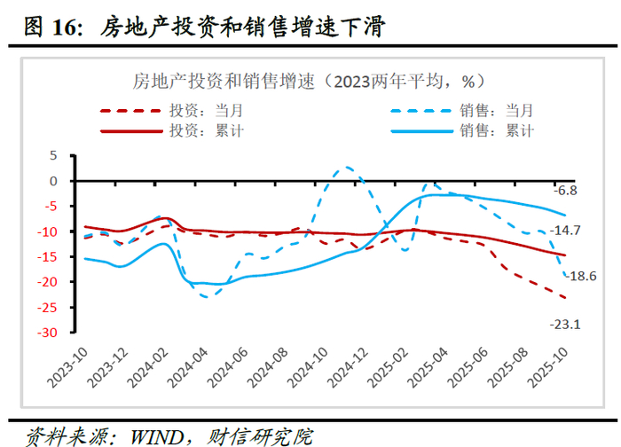 1-10月份广义和狭义基建投资分别同比增长1.5%和下降0.1%,较1-9月回落1.8和1.2个百分点,财政资金支撑减弱以及城投融资收缩或是主要原因。具体看:其一,政府债券对基建的支撑作用继续减弱。10月份项目收益专项债券、一般债、一般国债、特别国债累计发行约4823亿元,较9月份缩减一半左右,较去年同期同比减少约1477亿元。其二,地方化债短期对基建投资来源形成拖累。据统计,2025年1-10月份城投债券净融资额为-4776.3亿元,城投严监管以及退平台提速对基建投资形成显著拖累。其三,分行业看,1-10月份电力热力燃气及水的生产和供应业、交通运输仓储和邮政业、水利和公共设施管理业投资增速,分别较1-9月份回落2.8、1.5和1.7个百分点。其中电力行业投资增速回落最多,主要源于前期高基数和新能源行业面临内卷压力影响;同时道路运输业、公共设施管理业投资降幅进一步扩大,反映出地方基建类财政支出在资金与项目两端均承压(见图14)。
