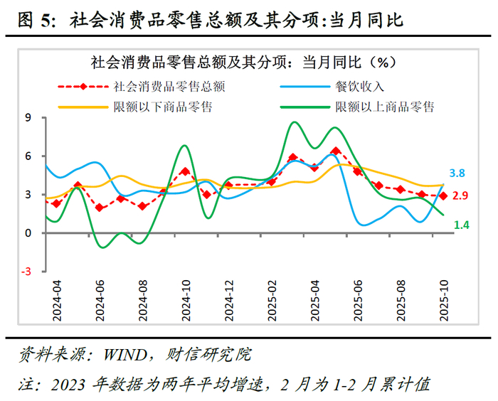 1-10月份社会消费品零售总额(简称社零,下同)同比增长4.3%,较去年全年提高0.8个百分点,延续恢复态势。10月当月社零同比增长2.9%,较上月回落0.1个百分点(见图5),去年同期基数抬升较多是主要拖累(2024年9月社零增长3.2%,10月为4.8%);社零环比增长0.16%,增速较上月提高0.28个百分点,表明消费实际上边际有所好转,具体表现为三个方面: