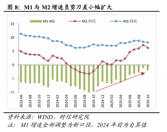 M1与M2增速负剪刀差较上月走扩0.8个百分点至-2.0%(见图8)。这一变化背后,主要与广义财政支出放缓、房地产超预期走弱和基数回升等因素相关,实体信用扩张力度偏弱。往后看,尽管增量财政政策落地生效有利于M1与M2增速差改善,但地产疲软、基数回升等拖累因素犹存,未来数月两者剪刀差大概率还会继续有所走扩。