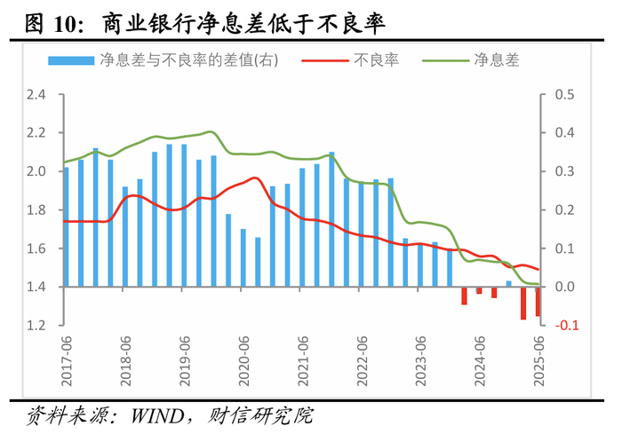 二是从约束条件看,银行净息差承压(见图10)、需求不足导致政策传导存在“软绳效应”等因素,持续制约货币宽松尤其是降息的空间和效果。当前货币政策面临的突出问题并非宽不宽松,而是需优先解决政策效果下降的梗阻。