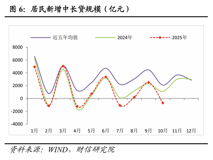 10月新增人民币贷款2200亿元,同比少增2800亿元(见图5);各项贷款增速较上月回落0.1个百分点至6.5%,延续下行态势并续创历史新低。结构上,票据融资冲量,企业信贷疲弱,居民融资收缩。具体看:一是票据融资同比多增3312亿元,为人民币贷款中唯一的多增项,主要与银行主动冲量弥补信贷缺口相关。二是企业新增短贷、中长贷仅分别为-1900、300亿元,同比持平和少增1400亿元。企业部门贷款疲弱,一方面与10月为信贷投放淡季相关,另一方面源于企业观望情绪浓厚,投融资意愿不强,此外新型政策性金融工具对企业信贷的拉动效果或暂未显现。三是居民新增短贷、中长贷双双出现净偿还,分别为-2866和-700亿元,同比少增3356、1800亿元(见图5-6),反映出居民消费、购房意愿还在继续下降。10月30大中城市商品房销售额同比下降26.6%,降幅较上月扩大近20个百分点,也对此形成佐证。从1-10月份累计数据看,居民部门新增贷款仅7396亿元,占全部新增信贷比重仅4.9%(见图7),两者均仅为各自峰值期的10%左右,居民信贷修复任重道远。