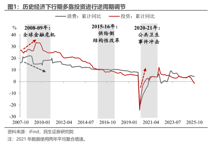 那么,稳投资还是稳消费?结合历史经验来看,除了2015-16年供给侧结构性改革这一特殊转型期外,在2008-09年全球金融危机与2020-21年公共卫生事件冲击期间,投资增速均率先反弹并引领经济企稳。