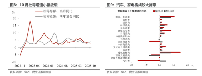 消费:社零增速小幅放缓,“双十一”前置有效对冲"以旧换新"动能减弱。10月社零增速小幅下行至2.9%,为去年8月以来的新低。究其原因,既有去年同期基数较高的影响(当月为全年增速峰值),也与“国补”政策资金消耗后“加力扩围”商品增长动能回落密切相关。