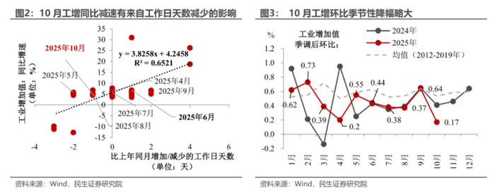 工业:“反内卷”及“稳外贸”双重压力下,工业生产放缓幅度大于季节性。无论是低景气度的制造业PMI还是增长下滑的出口,都预示了10月工业生产的放缓。同比上,工增增速从9月的6.5%放缓至10月的4.9%,有今年10月工作日比去年更少的影响;环比上,10月工增通常都会季节性放缓(受“十一”放假、工作日边际减少,以及节前部分需求已前置释放等因素影响),不过今年放缓的幅度比历史更大。