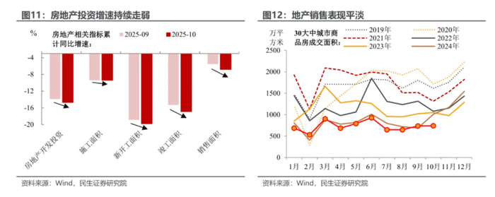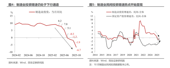 制造业:虽然增速降至2020年以来的低点,但有望在今明两年的经济过渡期中筑底企稳。自4月美国加征关税以来,制造业投资同比增速便处于下行通道,10月降幅从9月的-1.9%进一步扩大至-6.7%。当前制造业民间投资整体依旧趋弱,不过拐点开始初步显现,后续有效需求及外部不确定性的修复进度、对企业投资动能的进一步企稳至关重要。