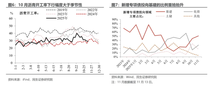 基建:在化债与增长的平衡中,基建投资正经历“减速换挡”。10月狭义基建投资增速从9月的-4.6%进一步下探至-8.9%,叠加沥青开工率超季节性回落,共同印证当前基建景气度仍处低位。考虑到今年以来财政资源持续向化解隐性债务风险倾斜,投资端的降温并不显意外。值得关注的是,近期新增专项债投向基建领域的比重已重拾升势,基建投资的拐点可能已渐行渐近。