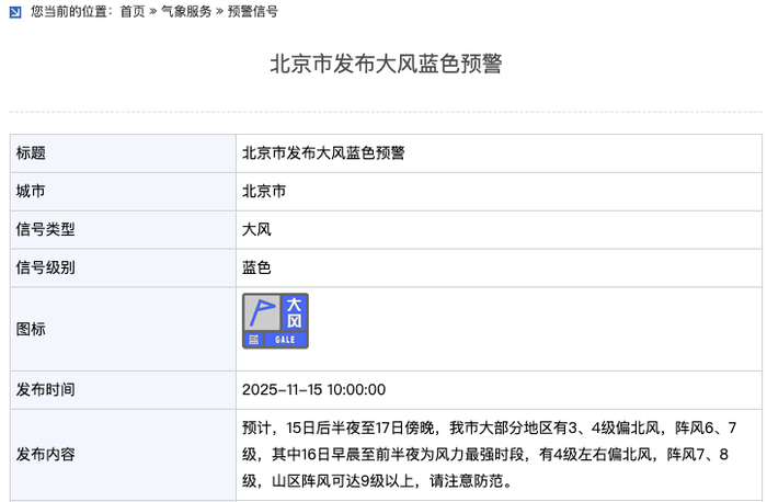 央视网消息:北京市发布大风蓝色预警:预计,11月15日后半夜至17日傍晚,北京市大部分地区有3、4级偏北风,阵风6、7级,其中16日早晨至前半夜为风力最强时段,有4级左右偏北风,阵风7、8级,山区阵风可达9级以上,请注意防范。
