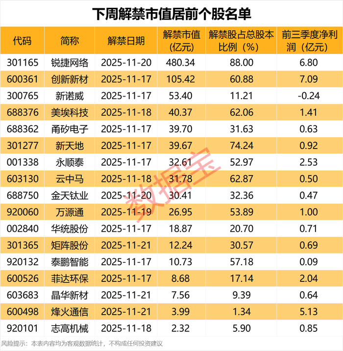 锐捷网络下周将有7亿股上市流通,主要为首发原股东限售股份,解禁市值达480.34亿元。
