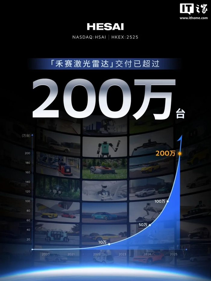 IT之家注意到,禾赛科技 11 月 13 日刚刚宣布:公司累计第 200 万台激光雷达已于 11 月中旬在禾赛麦克斯韦智造中心正式量产下线并交付客户。禾赛成为全球首个累计量产并交付超 200 万台的激光雷达企业,再次达成行业重磅里程碑。