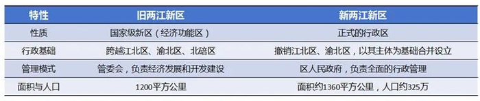 这背后的意义在于,两江新区完成从“经济功能区”向“行政区”的跨越。两江新区原本是国家级新区,即功能区。2010年6月18日挂牌,成为了继上海浦东新区、天津滨海新区之后的全国第三个国家级开发开放新区。与省、市、县、乡等行政区不同,功能区并非一级完整的政权组织,而是为实现特定经济发展目标而设立的管理区域,比如经济特区、经济技术开发区、高新技术产业开发区、新区、自由贸易试验区等等。不过,在部分超大特大城市,经济功能区与行政区交叉,会导致条块分割、职责边界不清、空间碎片零散并存等问题。此前的两江新区,地跨江北区、渝北区、北碚区三个行政区,实行“1+3”联合开发模式。随着时代发展,功能区和行政区割裂,管理重叠与管理真空并存的情况不时出现,严重影响区域高质量发展。这一次区划调整,就是一次管理权与责的梳理,去内耗、简化行政上的流程,充分释放两江新区的发展空间。