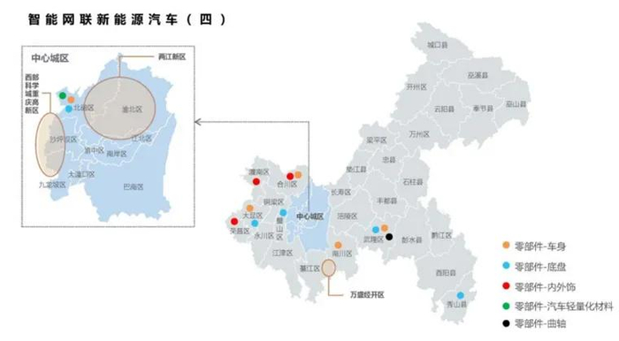 按照每个区县不超过2个优先发展的主导产业和不超过4个重点发展的特色产业的明确布局原则,新两江新区占据了3大万亿级主导产业集群中的2大——智能网联新能源汽车和新一代电子信息制造业,也是重庆最重要的支柱产业。