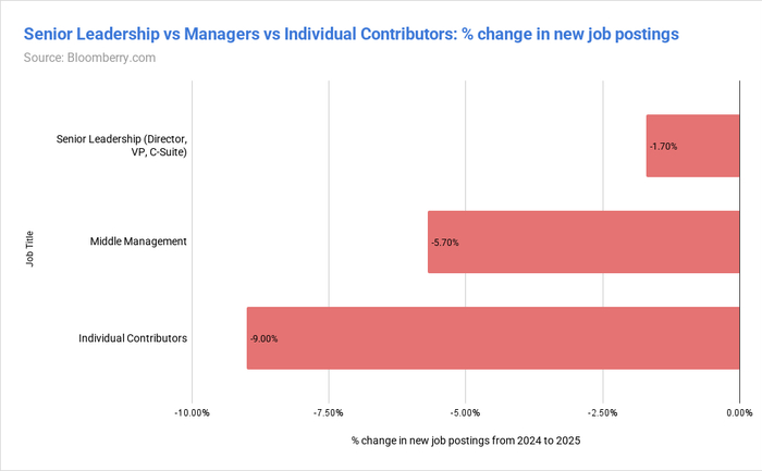 虽然整体就业市场收缩了8%,但高级领导层职位几乎没有下降,只跌了1.7%。