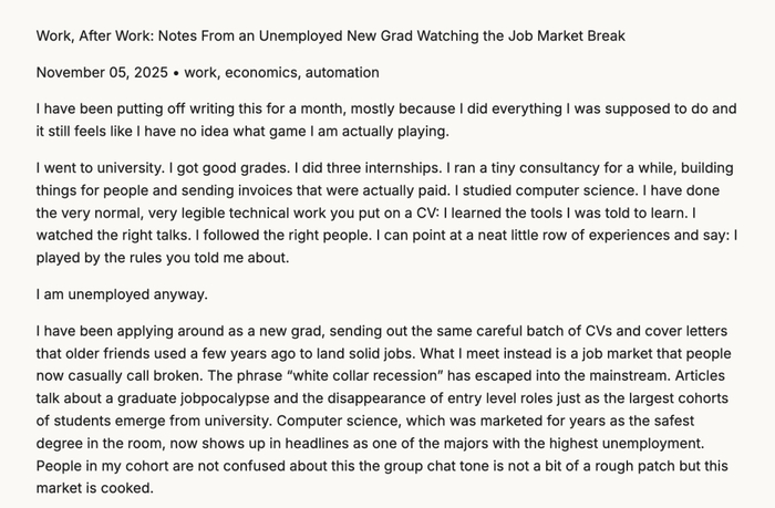文章名字叫做:《Work, After Work: Notes From an Unemployed New Grad Watching the Job Market Break》,翻译过来就是:《工作之后:一位失业应届毕业生观察就业市场崩溃的笔记》