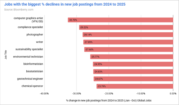 下面这张图是2025年跟2024年相比降幅最大的前10个职业,从上到下分别是CG艺术家(影视特效 / 3D)、合规专员、摄影师、作家、可持续发展专家、环境技术员、生物信息学家、生物统计学家、岩土工程师、化工操作员。