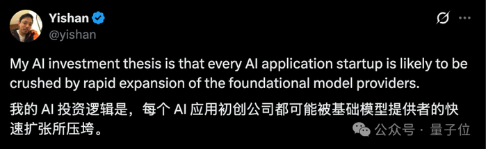 简单来说,他的观点是:基础模型掌握算力等底层优势,几乎只要出现一个新应用,基础模型就能在几天之内学会。