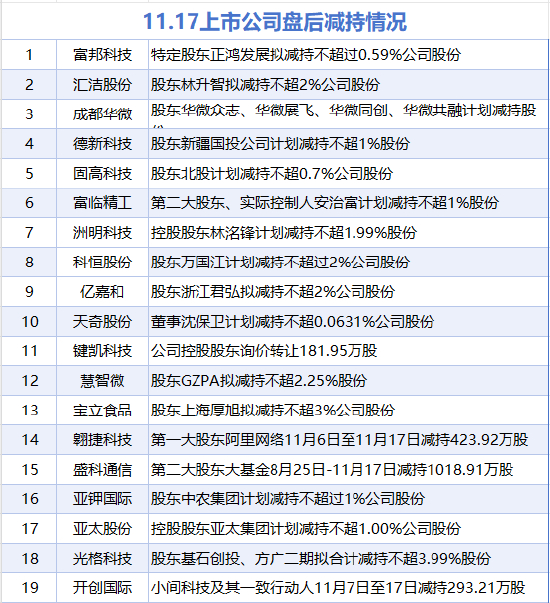据统计,11月17日,盘后皇台酒业披露增持情况。包括富邦科技、汇洁股份、宝立食品、成都华微、固高科技、富临精工、洲明科技、科恒股份、亿嘉和、天奇股份、键凯科技、慧智微、翱捷科技、德新科技、盛科通信、亚钾国际、光格科技、开创国际、亚太股份在内的19家A股上市公司披露减持情况。