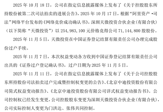 11月11日,公司发布公告称,本次司法拍卖过户已完成,公司控制权已经发生变更,公司控股股东变更为深圳天微投资合伙企业(有限合伙),公司实际控制人变更为门洪达、张伟共同控制。