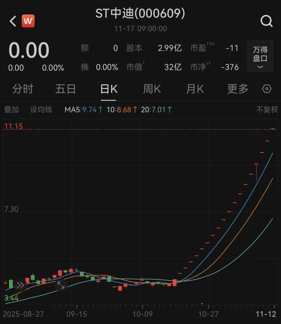 停牌前,ST中迪股价已经连续19个交易日涨停。