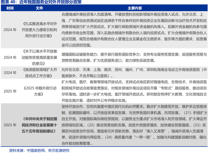 2026年起,以“服务业”为主要对象,对外以自贸区与自贸港等为载体、对内以限制类政策放松为表征的制度型开放或进一步提速,也酝酿着重要时代机遇。十二项工作安排中,“扩大高水平对外开放”的排位由十四五的第9前移至十五五的第5,表征意义明显。以过往不同,十五五更强调制度型开放和深度突破,或对标国际最高标准的贸易规则,聚焦规则、规制、管理、标准等方面的对接与创新。开放对象,或聚焦于金融、医疗健康、科教文娱、法律咨询、人才服务等生产服务业。与此同时,国内扩内需政策或将更加强调“投资于人”,促消费思路或进一步向服务业倾斜。