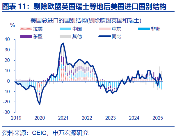 ④上半年美国总进口同比激增,主要由欧盟英国、瑞士和东盟推动,但剔除特定商品影响后,美国总进口增速并未出现大幅上升。其中,欧盟英国、瑞士和东盟分别贡献美国总进口12.9、6.6和3.0个百分点,但美国从这些地区进口多为特定商品(金银珠宝、药品),并非普遍性“抢进口”。若剔除这些商品后,美国总进口增速今年上半年未出现大幅上升。