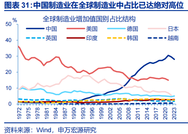 ③国内产业实现全面升级下,出口结构更多向高附加值领域集中。2025年上半年,纺织服装、家具、玩具等低附加值消费品,出口金额占比从2017年的15.5%、3.9%和2.4%分别下降至10.7%、3.3%和2.2%;新三样、机械设备及零件、半导体器件等高附加值中间品、资本品,出口金额占比分别从2017年的1.3%、8.1%和3.7%增长至10.3%、10.8%和5.5%。