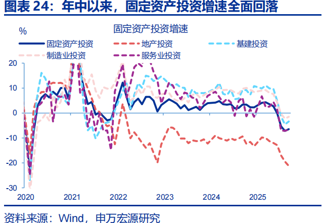 化债力度加大,对投资资金的“挤出效应”缓解,有利于2026年投资增速修复,盈利见底改善,也有利企业投资意愿的恢复;投资增速节奏上更容易“前低后高”。2025年,化债加快过程中,一度对投资资金形成“挤出”⑩,年底即出台针对性措施补充地方财力,2026年预估还会进一步加大支持力度,有利于2025年中以来投资增速异常回落的情况出现修复。化债加速过程中,年中以来企业应收账款大幅回落、利润率见底改善的趋势形成,通常领先投资一年左右,在2026年也将成为支撑投资增速的有效力量。但考虑到PPI增速明显的“前低后高”,投资增速或呈“前低后高”趋势。预计2026年固定资产投资增速回到3%左右,有望好于2025年。