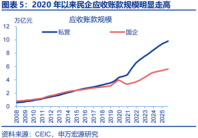 ②企业端的“疤痕效应”表现为,内卷化倾向持续加剧导致利润率不断下降,以及地方政府、平台公司的现金流压力向企业端传导进而导致企业应收账款规模大增等