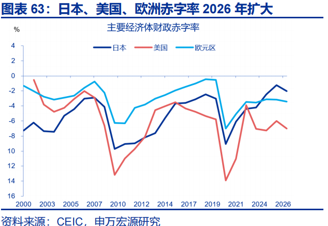 2026年,美、欧、日扩张性财政政策、中美关税冲突阶段性缓和,以及新兴经济体工业化进程的延续等,或致中国出口韧性延续;但需留意出口表现的区域分化。美国通过《美丽大法案》延长并扩大减税规模,扩大国防支出,或拉动GDP增速0.6个百分点;日本高市早苗上台,或带动防务支出扩大、补贴常态化,但支持率及执政联盟并不稳定或拖累财政扩张能力;欧洲财政以德国为代表整体转向宽松,扩大国防、基建与气候支出,但地缘政治影响等仍需观察、高基数不利出口读数。中国对新兴经济体的出口增速仍将保持高韧性、份额继续提升。预计2026年出口增速4%左右。