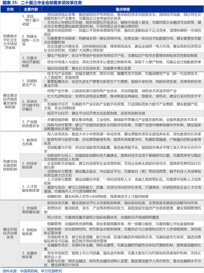 向“改革”要红利,或可重点关注:统一大市场建设等相关的经济体制改革、社保统筹等为代表的民生保障体制改革、财税金融体系改革、加快绿色转型等。与以往改革相比,“十五五”期间的改革更强调系统性与实效性,四中全会将“完善宏观经济治理”升级为“完善宏观经济治理体系”,凸显了改革的全局思维。进一步全面深化改革,重点关注:构建高水平社会主体市场经济体制(全国统一大市场建设等)、发展新质生产力(壮大新兴与未来产业发展、更适配的教育科研与人才培养等体制机制等)、民生保障相关(社保统筹、生育支持等),财税金融改革、绿色低碳转型等。