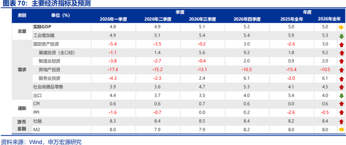 2026年,通胀尤其PPI同比走势或是影响市场节奏最重要的宏观指标,眼下PPI同比上行趋势或已形成、CPI同比亦将有所改善,带动企业盈利持续修复。2026年,国际定价为主的品种中,油价或有所回落、铜价或保持高位,国内钢价或低位震荡、煤价或有所上行,“反内卷”执行力度或是决定PPI修复程度的主因而非大宗商品价格。2026年,生猪养殖“反内卷”的影响有利食品CPI表现,PPI同比上涨或支撑核心CPI改善,但考虑到结构性失业持续压制虚拟房租等,预计CPI总体回升幅度或相对温和。预计2026年PPI、CPI同比分别-0.5%、0.6%;2025年预计分别-2.6%、0%。