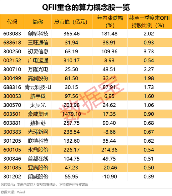 17只算力概念股获得外资重仓,其中初灵信息、万隆光电、剑桥科技、高澜股份等7股的三季度末QFII持股比例居前,均超1%。获得QFII重仓的概念股中,剑桥科技、三旺通信、初灵信息、广电运通月内获得机构调研,剑桥科技累计获得70家机构调研,公司表示,1.6T光模块产品测试数据与行业头部企业水平基本相当,目前部分产品已进入小批量供货阶段,预计至2026 年一季度可实现大量发货。