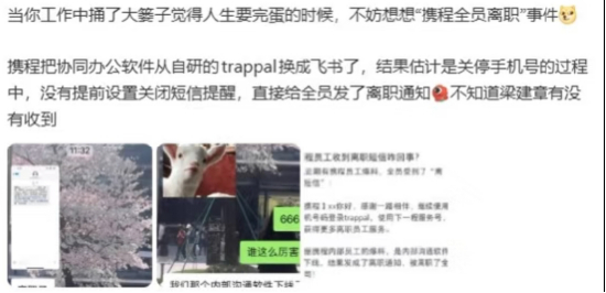 此前,一则以“XX你好,感谢一路相伴”开头的短信在网络流传,内容涉及继续使用手机号登录内部沟通软件trappal及“下一程”离职员工服务。由于短信以携程官方名义发出,引发部分员工误以为遭遇“被离职”。