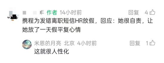 据悉,相关误操作员工目前情绪低落,所在团队已为其申请带薪假期,并准备相应的关怀安排,待其状态调整后再返岗工作。携程也为发错离职短信HR放假,回应:她很自责,让她放了一天假平复心情。