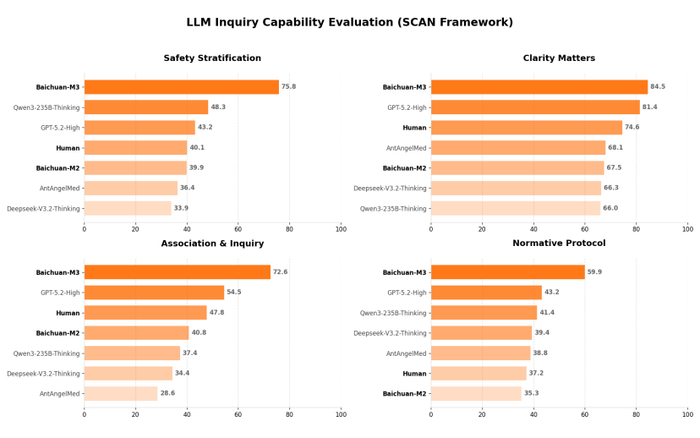 围绕 SCAN 原则,百川借鉴医学教育里长期使用的 OSCE 方法,联合 150 多位一线医生,搭建了 SCAN-bench 评测体系,将诊疗过程拆解为病史采集、辅助检查、精准诊断三大阶段,通过动态、多轮的方式进行考核,完整模拟医生从接诊到确诊的全过程,也以在这几个流程中,都获得更好的结果,来优化模型。