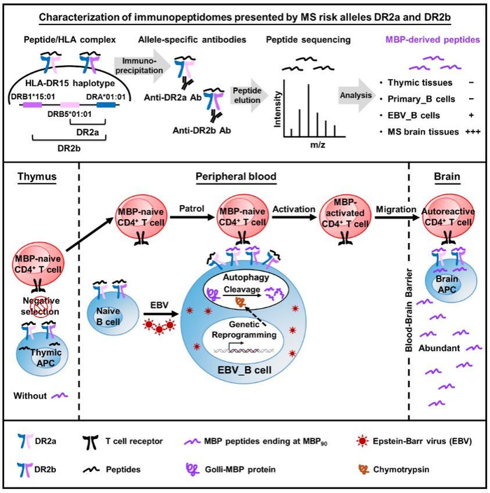 在遗传因素方面,特定的人类白细胞抗原单体型 HLA-DR15 是已知最强的 MS 遗传风险因子,可贡献高达 60% 的遗传风险。该单体型编码的分子主要负责向 CD4+T 细胞呈递抗原片段,这与 MS 作为 CD4+T 细胞介导的自身免疫病本质相符。尽管已知 EBV 感染和 HLA-DR15 均与 MS 高度相关,但两者如何协同作用导致疾病的具体机制此前尚未完全阐明。