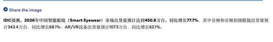 IDC预测,2026年中国智能眼镜市场出货量预计达到450.8万台,同比增长77.7%,其中音频和音频拍摄眼镜出货量预计343.4万台,同比增长68.1%;AR/VR设备出货量预计107.3万台,同比增长62.1%。