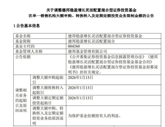 一则关于巨量资金涌入的市场传闻在社交平台扩散,随即引发投资者高度关注。尽管具体申购规模未被官方披露,但德邦基金很快发布限购公告,自2026年1月13日起,对单一销售机构的大额申购进行额度调整。这一动作,也在客观反映出短期资金集中流入的现实压力。