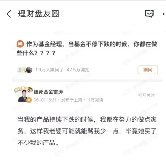 2023年,在面对“产品持续下跌时基金经理在做什么”的提问时,雷涛给出的答案并非技术分析或市场判断,而是带着自嘲意味的生活化回应。他回复称:“当我的产品持续下跌的时候,我都在努力的做点家务,这样我老婆可能就能骂我少一点,毕竟她买了不少我的产品。”