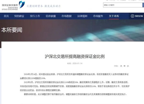 2026年1月14日,经中国证监会批准,沪深北交易所发布通知调整融资保证金比例,将投资者融资买入证券时的融资保证金最低比例从80%提高至100%。