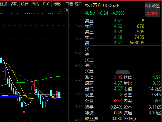在此消息影响下,1月14日上午该股一字跌停。截至上午收盘,*ST万方报4.57元/股,下跌4.99%,封单超66万手。