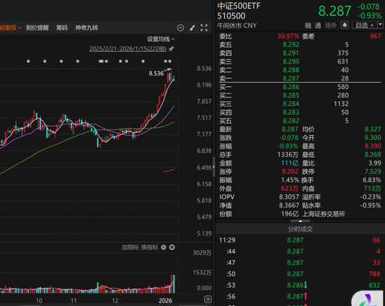 除了华泰柏瑞沪深300ETF以外,多只中证A500ETF成交量也显著放大。华泰柏瑞中证A500ETF成交额为126亿元,接近昨天全天的135亿元;华夏中证A500ETF成交额为123亿元,昨日成交额为146亿元。此外,南方中证500ETF成交额为111亿元,逼近昨天全天的113亿元成交额。