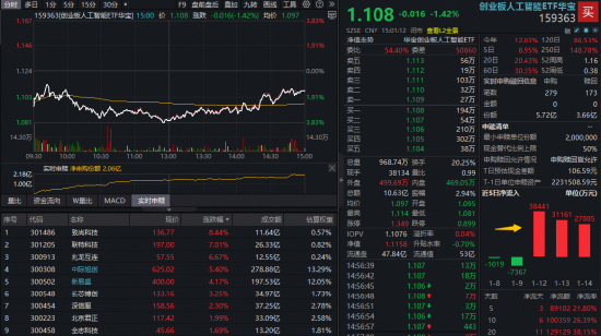 热门ETF方面,双线布局“算力+AI应用”的创业板人工智能ETF(159363)早盘一度下探逾3%,尾盘跌幅收窄,日线顽强收阳!单日成交超10亿元,资金持续加码,全天净申购2.06亿份,此前三日已累计增持9.7亿元。